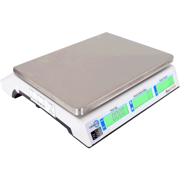 Balanza liquidadora marca Trumax, disponible en versión plana o de Torre, fabricada en ABS de alta resistencia, plato en acero inoxidable de 34x24cm, display LCD, batería recargable, Capacidad Maxima:15/30kg, División de Escala 5/10g, Con certificación OIML, homologada para metrología Legal en Colombia, cumplen resolución 77506 de la Superintendencia de Industria y Comercio.