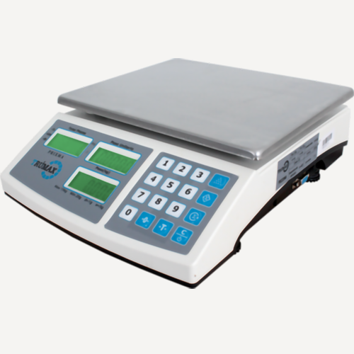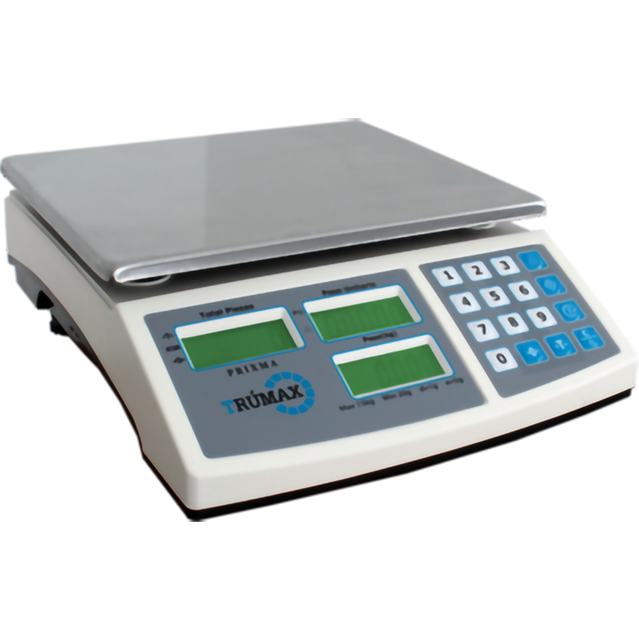 Balanza contadora de piezas Trumax, construida en ABS de alta resistencia, plato en acero inoxidable de 27 x 21 cm, ideal para el conteo de pequeñas piezas, con gran precisión, fácil de usar, display LCD retro-iluminado de excelente visualización, batería recargable con autonomía de 40 a 60 horas de duración. Funciones de acumulación de piezas, calculo de peso promedio unitario de las piezas. Capacidad máximas disponibles: 3kg, 6kg, 15kg y 30 kg.