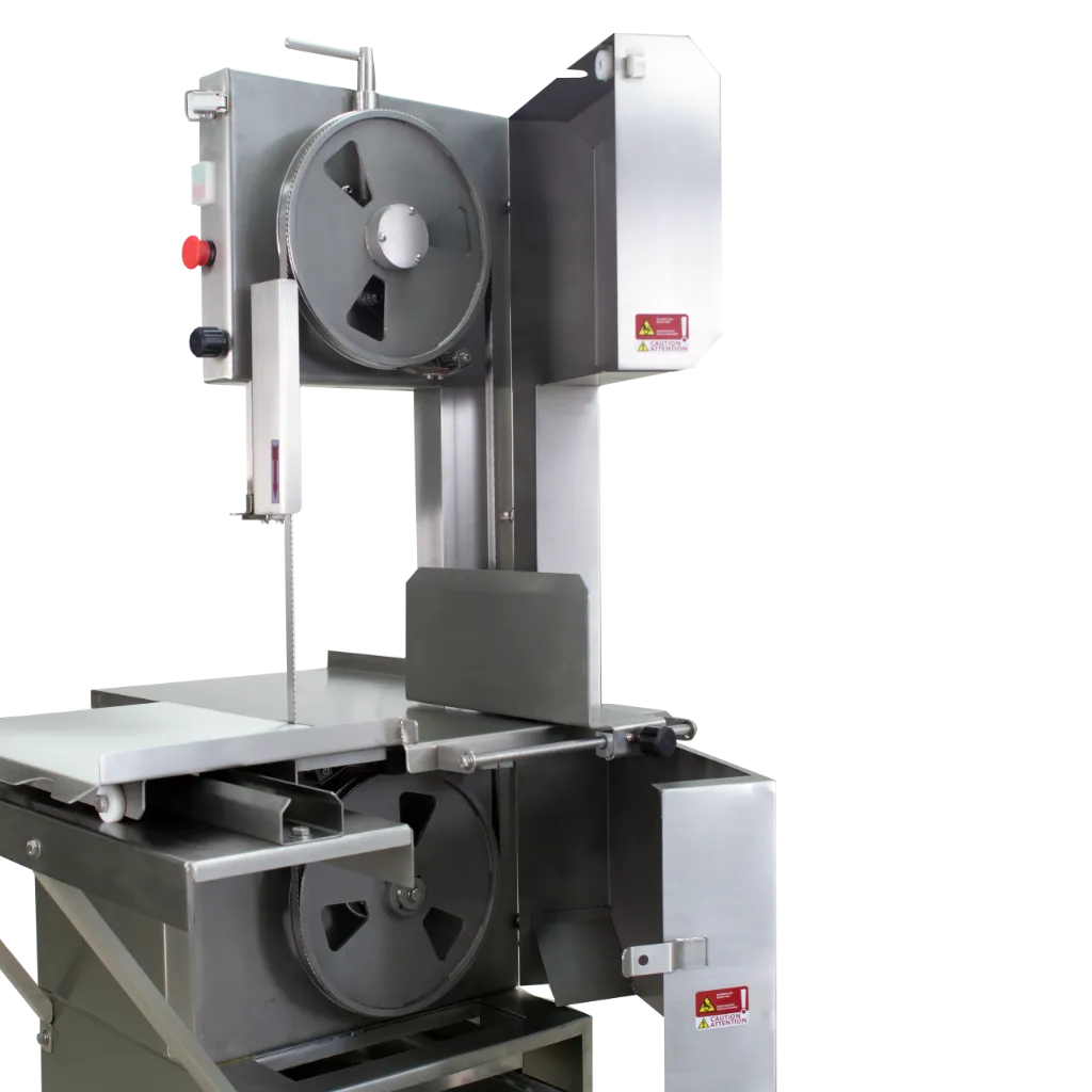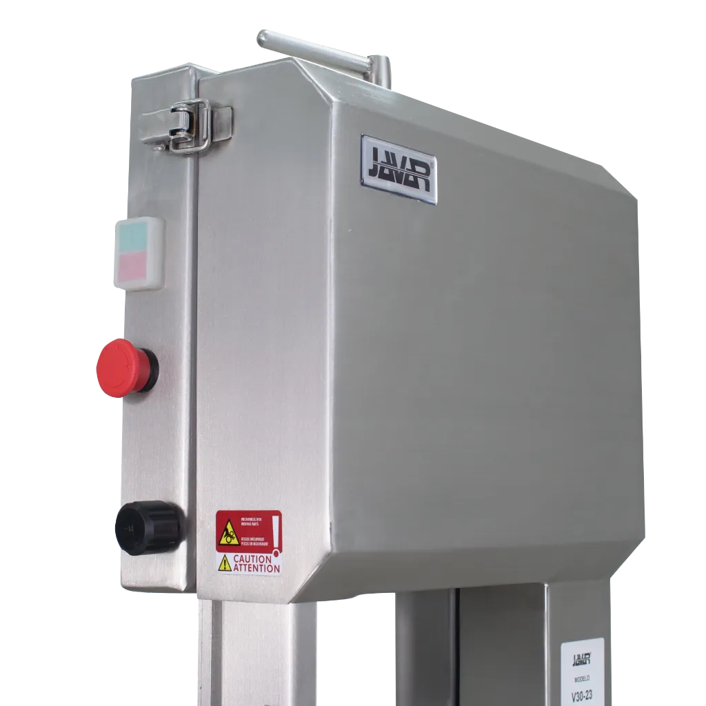 Sierra para corte de carne con hueso o carne congelada marca JAVAR línea PROFESSIONAL. Modelo eléctrico de piso para uso intermitente, ideal para carnicerías medianas y supermercados. Puede procesar hasta 2 canales diarias (400 kg/día). Estructura y volantes fabricados en acero inoxidable, material que cumple las actuales normas sanitarias (decretos 1500 y 3075). Altura de corte 36 cm, ancho de garganta 27 cm. Longitud de la cinta 98″. Diámetro del volante 30 cm. Reductor de larga vida con piñones de acero en baño de aceite. Sensor de seguridad en la puerta y botón de paro de emergencia. Potencia 2 HP, tensión 110 Volt, 60 Hz, 1 fase. Dim 78x91xH169 cm, peso neto 130 kg. Origen: Colombia