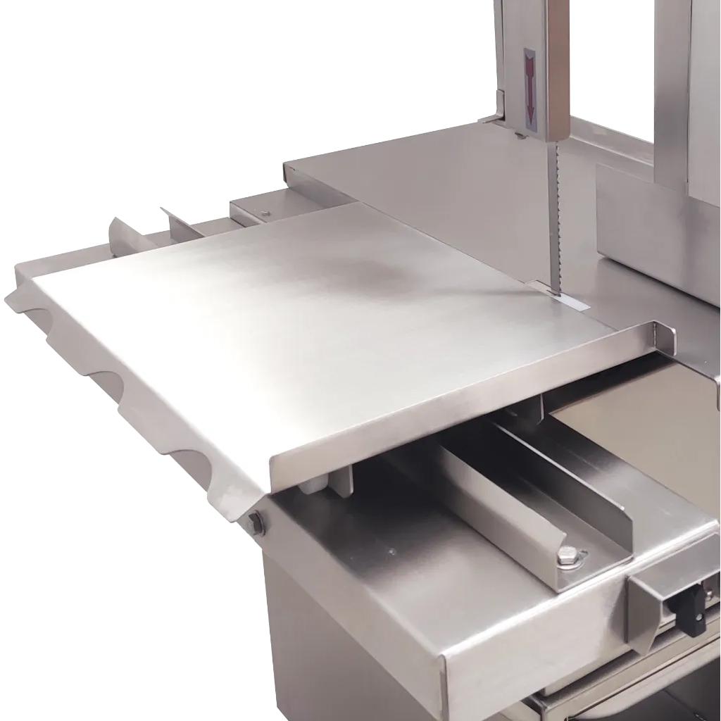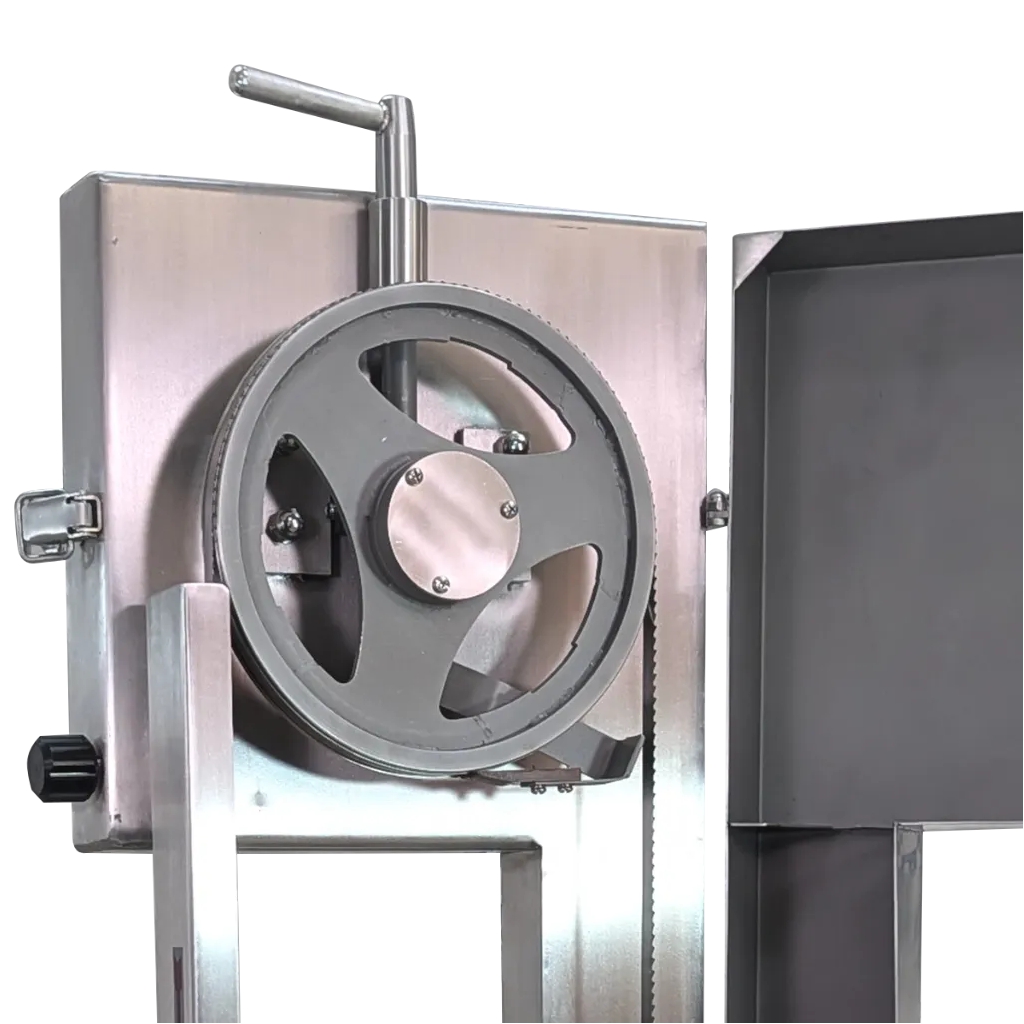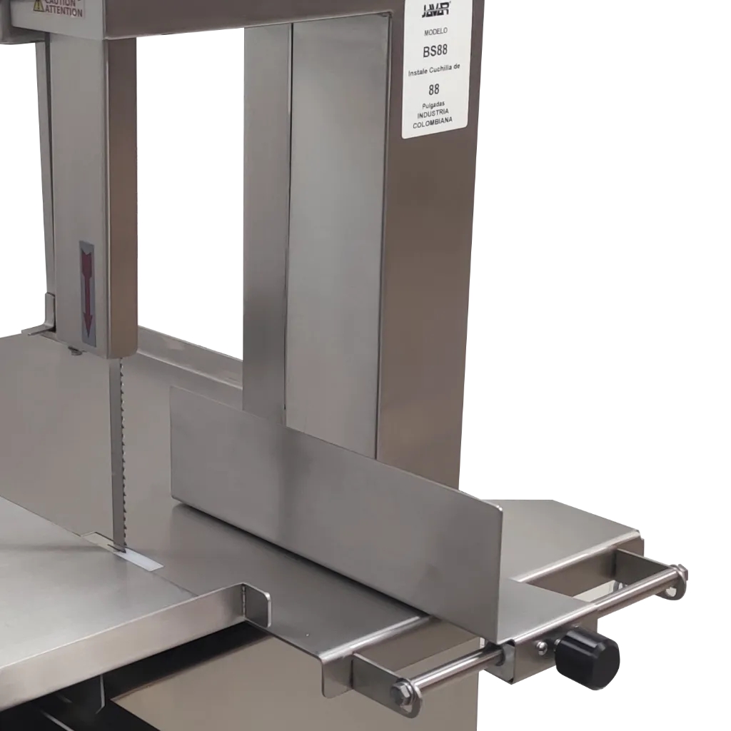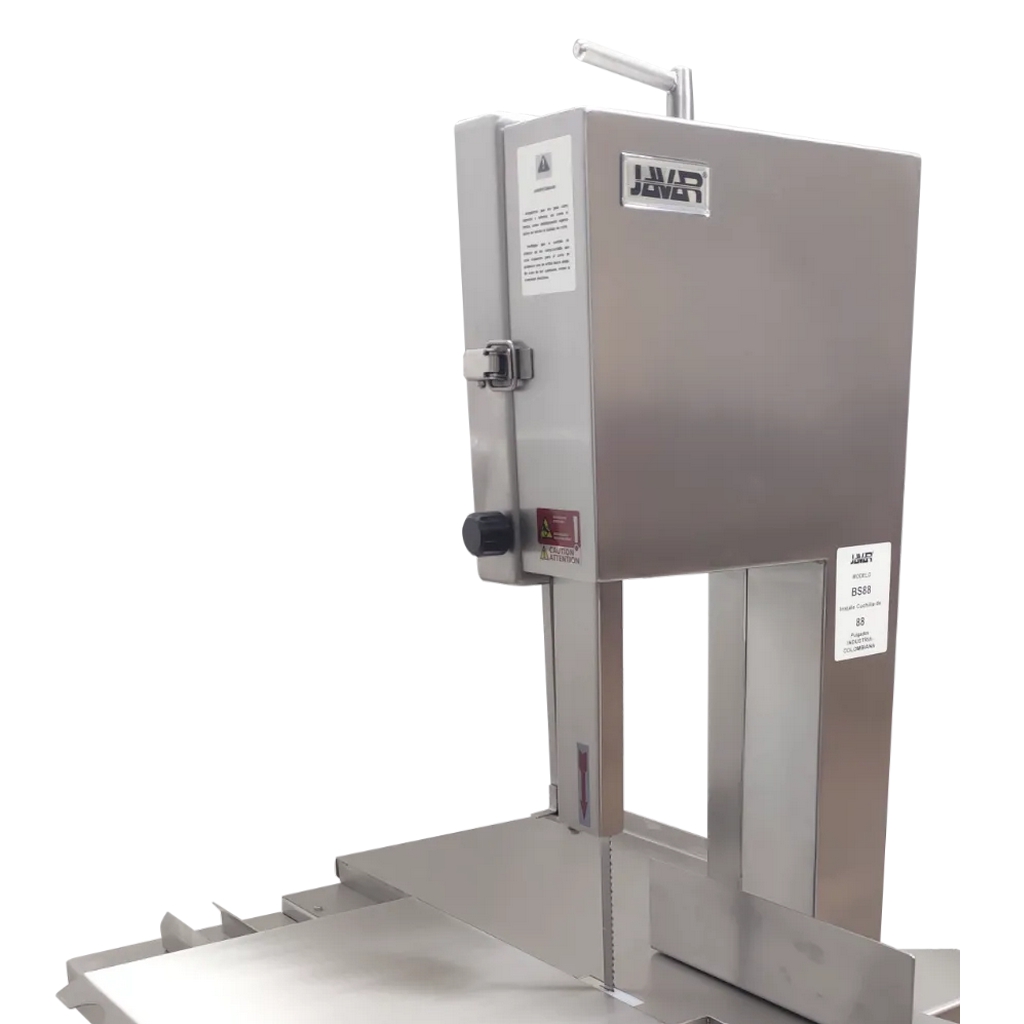 Sierra para corte de carne con hueso o carne congelada marca JAVAR línea SOLUTION. Modelo de piso para uso intermitente, ideal para pequeñas carnicerías. Puede procesar hasta 1 canal diaria (200 kg/día). Estructura y volantes fabricados en acero inoxidable, material que cumple las actuales normas sanitarias (decretos 1500 y 3075). Altura de corte 22 cm, ancho de garganta 21 cm. Longitud de la cinta 78″. Diámetro del volante 25 cm. Reductor de larga vida con piñones de acero en baño de aceite. Potencia 1 HP, tensión 110 Volt, 60 Hz, 1 fase. Dim 65x80xH150 cm, peso neto 102 kg. Origen: Colombia