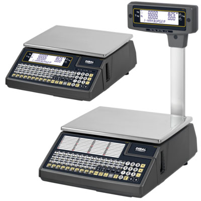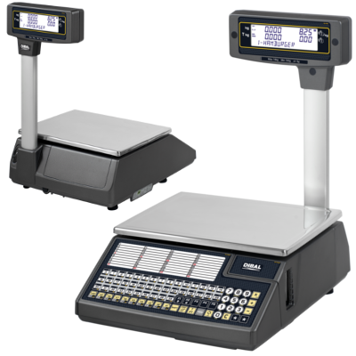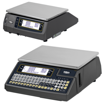 Balanza Dibal con impresora de etiquetas o ticket, construida en ABS de alta resistencia, doble display LCD reto-iluminado para comprador y vendedor, 10 vendedores, hasta 5000 productos, 40 x 2 teclas directas para productos, permite manejar publicidad en el display, interconexión de hasta 10 balanzas, formatos de impresión programables para ticket y etiqueta, impresión de logos, código de barras EAN 13, programación y configuración por PC. Doble rango medición 30kg x 10g y 15kg x 5g.